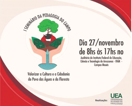 No dia 27 deste mês, o Curso de Pedagogia do Campo do Centro de Ensino Superior de Maués (267 km da grande Manaus) vai realizar o 1º Seminário de Pedagogia do Campo, como o tema “Valorizar a Cultura e a Cidadania do Povo da Floresta e das Águas”. O evento vai acontecer no auditório do Instituto Federal de Educação, Ciência e Tecnologia de Maués (IFAM) na zona leste da cidade. Participe.