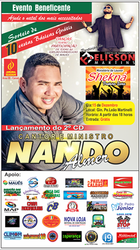 O cantor evangélico Nando Almer lançará no próximo dia 15 de dezembro em evento beneficente no Ginásio Padre Leão Martinelli em Maués (AM), o seu 2º CD de músicas gospel. O primeiro CD lançado em 2013 pelo cantor foi um sucesso e agora a pedido dos amigos e do público que prestigia a boa música gospel lança seu novo trabalho.