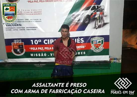 Maués (AM) – Segundo a 10ª Companhia Independente da Polícia Militar Na Madrugada desta terça-feira (11) por volta das 3h00h, em patrulhamento nas ruas da cidade, a VTR no comando do 1º Sargento Bindá e Cabo Walteles avistaram dois homens em atitude suspeita em uma moto Biz Preta. De acordo com a PM os dois ao avistarem a viatura se aproximar ainda tentaram empreender fuga sem sucesso, o motorista conseguiu fugir e jogou a moto, que acabou caindo em cima de seu comparsa que acabou ficando preso debaixo, o meliante conseguiu ser preso pelos policias que ao fazer a revista no mesmo foi encontrada uma Arma de Fabricação Caseira, os dois meliantes estariam fazendo arrastões pela cidade.