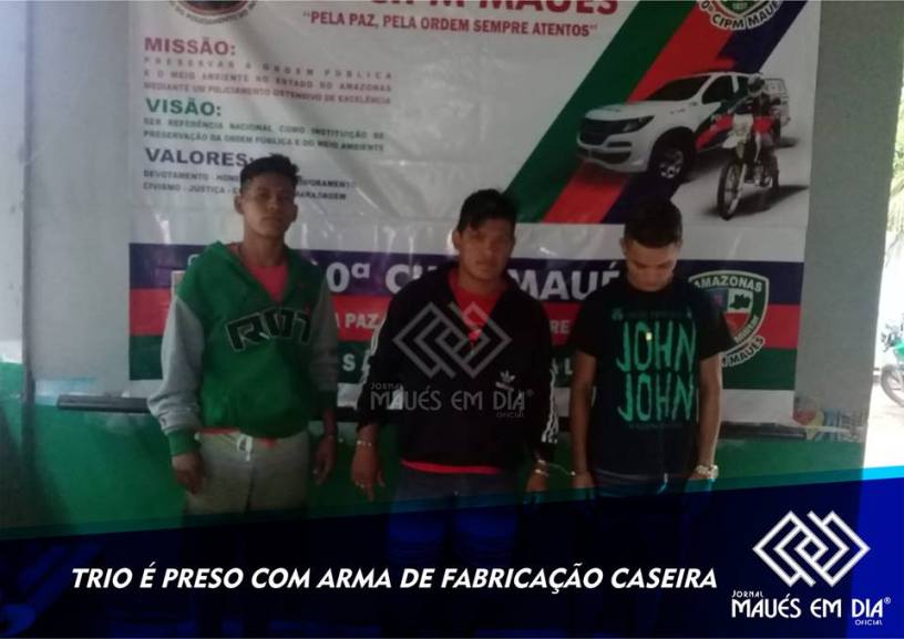 MAUÉS (AM) – Na manhã desta segunda-feira (28), a Guarnição da 10ª Companhia Independente da Polícia Militar (CIPM) formada pelo 2º Sargento G. Silva e 2º Sargento Erlande, receberam uma denúncia via linha direta informando que três homens estariam em uma motocicleta modelo Pop de cor preta e em posse de uma Arma. Segundo a PM, a VTR em patrulhamento pelas ruas da cidade conseguiu avistar os homens e logo foi feita a abordagem nos mesmos, ao fazerem a revista foi encontrada uma arma de fabricação caseira com uma munição intacta.