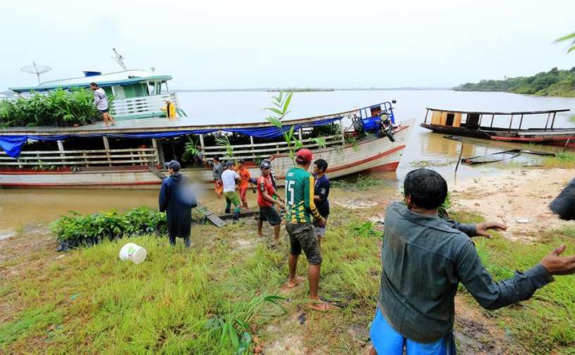Animados com a iniciativa do prefeito de Maués os comunitários ajudaram no descarregamento das mudas da embarcação de Secretaria de Municipal de Produção (Sepror) para a sede da comunidade, uma das maiores da calha do Rio Apocuitaua.