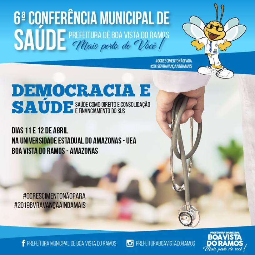 PREFEITURA DE BOA VISTA DO RAMOS (AM) – Nos dias 11 e 12 de abril, a Prefeitura Municipal de Boa Vista do Ramos (270 km da grande Manaus), por meio da Secretaria Municipal de Saúde, vai realizar a 6ª Conferência Municipal de Saúde. Com o tema “Democracia e Saúde – saúde como direito e consolidação e financiamento do SUS”, a conferência vai discutir temas para a melhoria contínua do serviço em nosso município. O encontro é aberto à toda a população e vai acontecer na Universidade do Estado do Amazonas (UEA), das 8h às 12h e das 14h às 18h. Venham e confiram o que estamos realizando para a melhoria da qualidade de vida de toda a nossa população.