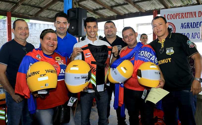 PREFEITURA DE MAUÉS (AM) – Na quarta-feira 1º de maio, através de mais uma ação do Banco do Povo de Maués, em parceria com o Departamento Municipal de Trânsito – Demut, o prefeito Junior Leite entregou novos coletes, camisas e capacetes (condutor e passageiro) para 120 Mototaxistas da Cooperativa dos Motaxistas de Maués – COMTAM. Este ano, os taxistas regularizados também foram beneficiados com a mesma ação de padronização.