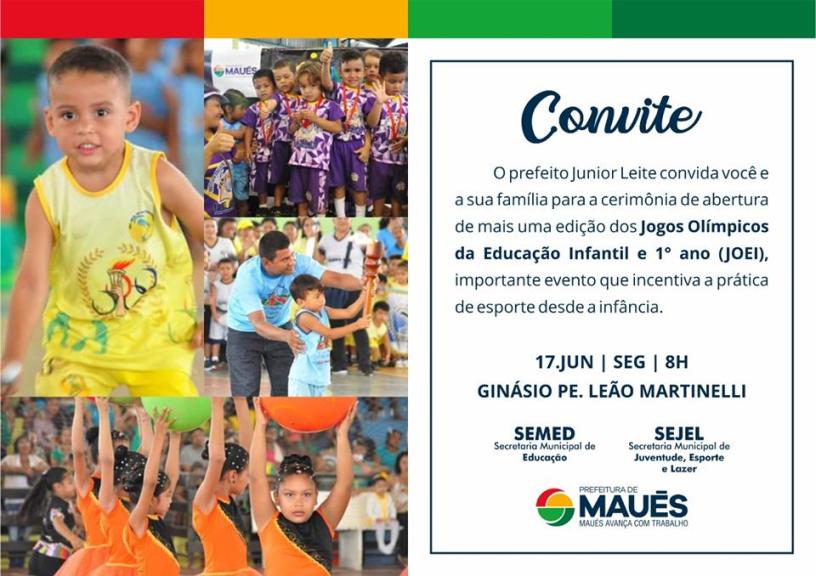 PREFEITURA DE MAUÉS (AM) – Os Jogos Olímpicos da Educação Infantil e 1º ano (JOEI) começarão na segunda-feira (17) e você é o nosso convidado para esse importante evento que incentiva a prática de esporte desde a infância.