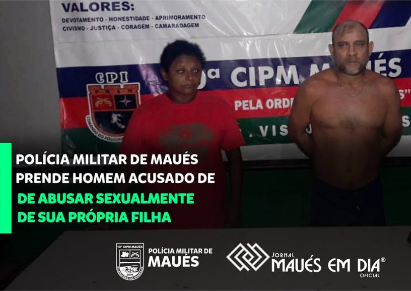 JORNAL MAUÉS EM DIA – A Policia Militar de Maués através de denúncias via linha direta, prenderam na noite de Quinta (11) dois elementos que atendem pelo nome de Hudson Pataxo Cidade e Verônica Valeriano dos Santos, os dois acusados são casados e tem uma filha que ainda é menor de idade, que atende pelas iniciais C.M.V (iniciais fictícias), a mesma estava sendo abusada sexualmente pelo seu próprio pai biológico, a menor acabou sendo expulsa de casa ao falar que estava sofrendo abusos, sua mãe a expulsou preferindo o seu marido do que a própria filha, a mãe da menor sabia dos abusos cometidos pelo seu marido.
