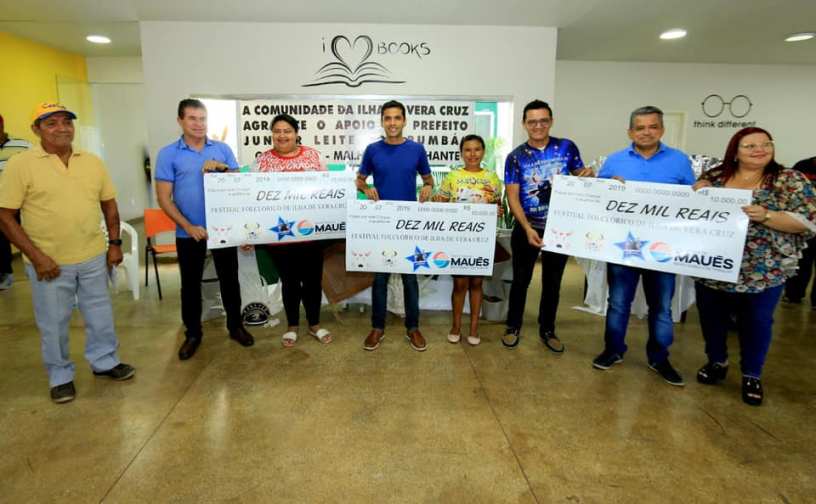 FOLHA DE MAUÉS (AM) – O prefeito Junior Leite entregou no último sábado (20) o repasse financeiro para os representantes de cada boi participante do Festival Folclórico da Ilha de Vera Cruz: Brilhante, Garantido e Malhado. Um total de R$ 30 mil. Houve ainda a entrega de 150 camisas oficiais temáticas de cada boi.