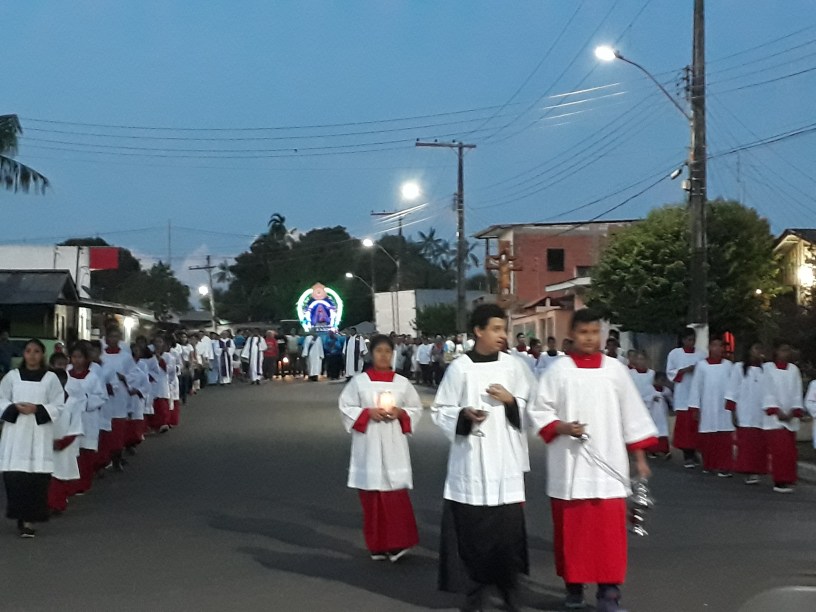 FOLHA DE MAUÉS (AM) – Com o tema Batizados e Enviados, católicos da Paróquia do Município de Maués (267 km da grande Manaus) celebram as festividades em honra a NOSSA SENHORA DA CONCEIÇÃO, padroeira a cidade. O círio com andor trazendo a imagem ducentenária da santa abre oficialmente o evento religioso na Terra do Guaraná.