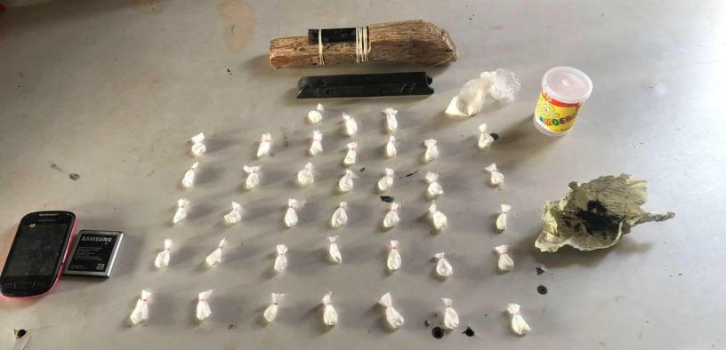 Segundo a 10a Companhia da Pm, ns revista pessoal, foi encontrado com o infrator um porção pequena de possivelmente maconha, ao fazer buscas no local onde o infrator havia se desfeito do objeto, foi encontrado um pote contendo 38 trouxinhas de possivelmente Cocaina e uma porção maior com 6.9g do mesmo entorpecente. Ainda de acordo com a PM, durante a ocorrencia o infrator afirmou que guardava uma arma de fabricação artesanal que tambem foi localizada pela guarnição de serviço.