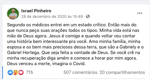 Em uma publicação no Facebook, ainda em 28 de dezembro, Pinheiro pediu orações e informou que amava sua esposa, e deixou dois filhos.