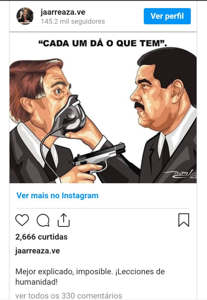 Ministro das relações exteriores da Venezuela postou uma charge em que Maduro segura oxigênio e Bolsonaro uma pistola, com a legada “cada um dá o que tem”