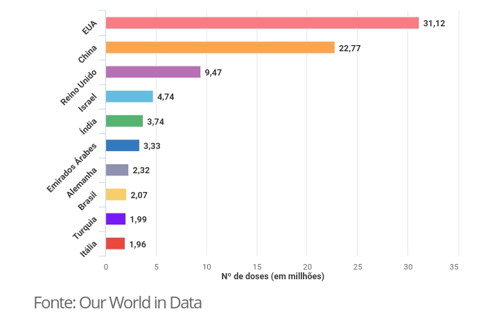 O Brasil tem pouco mais de 2 milhões de vacinas aplicadas até o momento (na quinta, o país ocupava a 12ª posição do ranking, com 1,13 milhão de vacinados). Os Estados Unidos seguem na liderança, com 31,12 milhões de doses administradas.