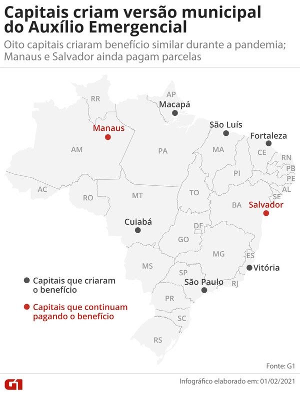 Um levantamento feito pelo G1 revela que as prefeituras de oito das 26 capitais lançaram uma versão municipal do Auxílio Emergencial, com o pagamento de dinheiro para pessoas afetadas pela pandemia. Atualmente, o benefício continua sendo pago aos inscritos em Manaus e Salvador, mas o programa já foi encerrado nas outras seis cidades.