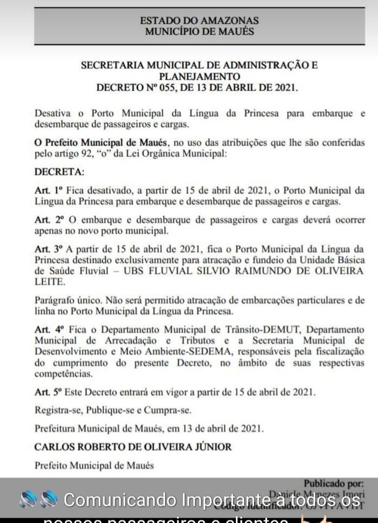 FMC- Na última quinta-feira 15, o Prefeito da Cidade de Maués (267 km de Manaus), Júnior Leite expediu o Decreto Municipal número 055 datado de 13 de abril de 2021, desativando o antigo Porto do Município denominado Língua da Princesa, rampa construída no início da década de 1970 pelo ex-prefeito Antônio Negreiros de Almeida (Tonico) para embarque e desembarque passageiros, cargas e encomendas. Visto que o velho ancoradouro não oferece condições estruturais para operar.