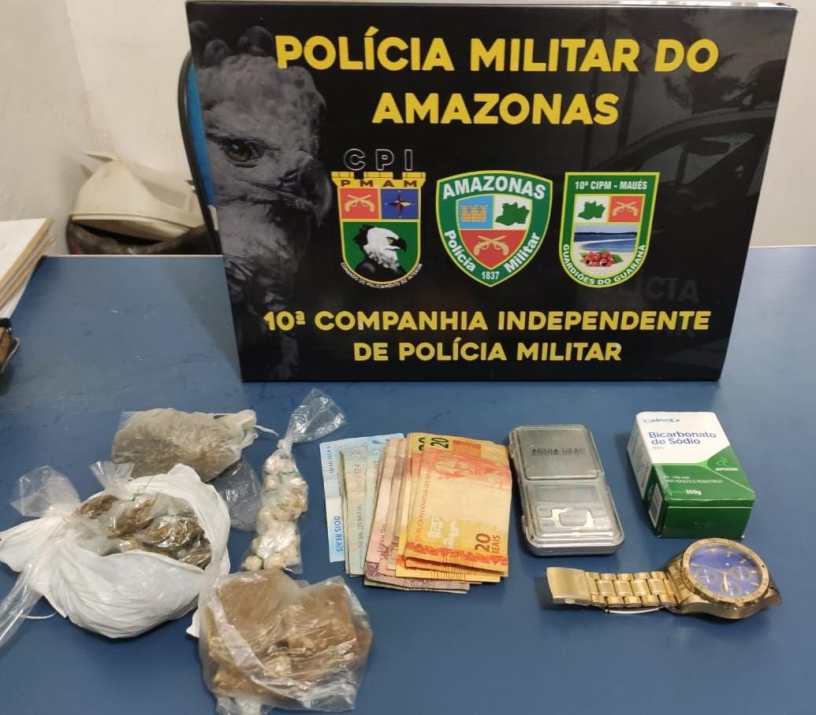 FMC- Policiais Militares da 10ª Companhia Independente de Polícia Militar – CIPM do Município de Maués em Conjunto com a Polícia Cívil, prenderam na tarde de sexta-feira 30, um homem de (24 anos), em Cumprimento ao Mandado de Busca e Apreensão expedido pela Justiça Estadual, o mesmo já tem passagem pela polícia por Tráfico de Drogas e já possuía mandado de prisão em aberto expedido pela Justiça. A 10a CIPM, informou a nossa Reportagem que a Guarnição de Serviço da Polícia Militar junto com a equipe de Investigação da 48a Delegacia de Polícia Cívil de Maués, se deslocaram até a Rua Amãna, Bairro Mirante do Éden zona norte da cidade, e realizaram um cerco policial em uma Residência localizada nesse endereço, e cumpriram um Mandado de Busca e Apreensão em desfavor do referido acusado que estava residindo nesta localidade. A PM, afirmou que durante a incursão na residência, o indivíduo foi detido e não apresentou resistência, numa revista na casa, foram encontrados (119.8g) de Substância Entorpecente Supostamente (Oxi), (25.2g) de Substância Entorpecente Supostamente (Maconha), (19) Trouxinhas de Substância Entorpecente Supostamente (Oxi), (32) Trouxinhas de Substância Entorpecente Supostamente (Maconha), (01) Cx. de Bicarbonato de Sódio, (01) Balança de Precisão, (01) Relógio de cor Amarela, e R$ 185,00 (em espécie).