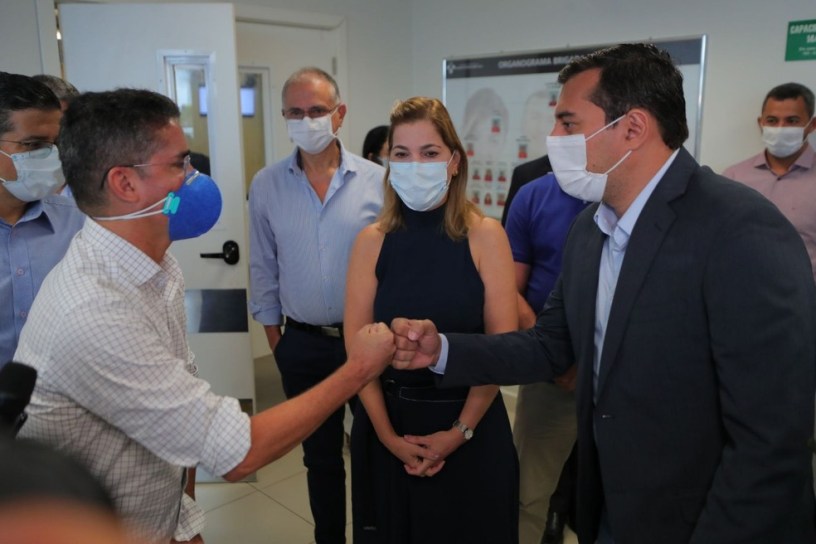 4 de janeiro – Prefeito David Almeida (esq.), Mayra Pinheiro (centro) e governador Wilson Lima durante visita a unidades de saúde em Manaus — Foto: Secom