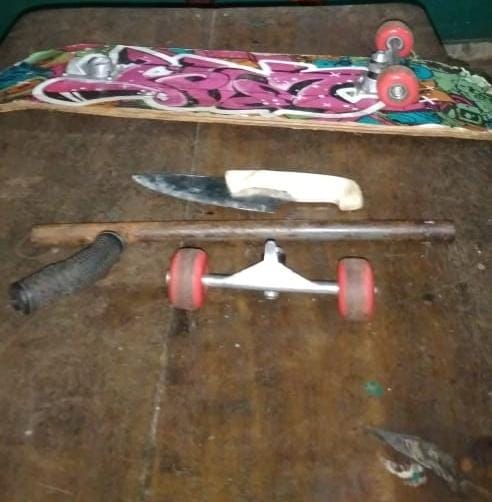 A PM informa que Equipe se deslocou até o local denunciado e constatou a veracidade da informação, na qual o homem foi abordado e revistado e foram encontrados em posse do mesmo (01) Faca, (01) Barra de Ferro, e (01) Skate.