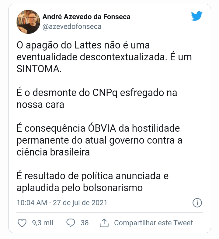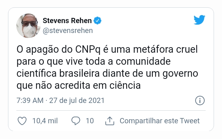 O neurocientista Stevens Rehen, da Universidade Federal do Rio de Janeiro (UFRJ), por exemplo, disse no Twitter que a situação representa “uma metáfora cruel para o que vive toda a comunidade científica brasileira diante de um governo que não acredita em ciência”.