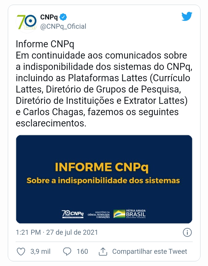 “O CNPq dispõe de novos equipamentos de TI e a migração dos dados foi iniciada antes do ocorrido [a indisponibilidade dos sistemas].”