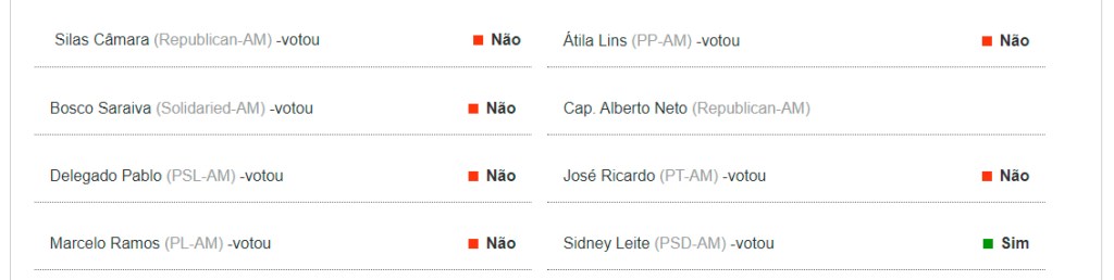Sidney Leite (PSD) foi o único deputado federal do Amazonas que votou a favor da proposta do “distritão”, sistema de eleição majoritário, no qual apenas os mais votados são eleitos. Átila Lins (Progressista), Bosco Saraiva (Solidariedade), Delegado Pablo (PSL), José Ricardo (PT), Marcelo Ramos (PL) e Silas Câmara (Republicanos) votaram contra.