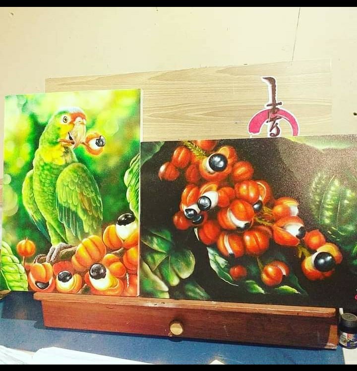 O artista Pedro, produz suas obras inspirados nos temas do Guaraná, produto comercializado na cidade, e a natureza local.
