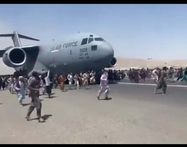 Um vídeo gravado no aeroporto de Kabul, no Afeganistão, viralizou nesta segunda-feira, 16. É possível ver pessoas pendurando-se em um avião de transporte C-17, da Força Aérea dos EUA.