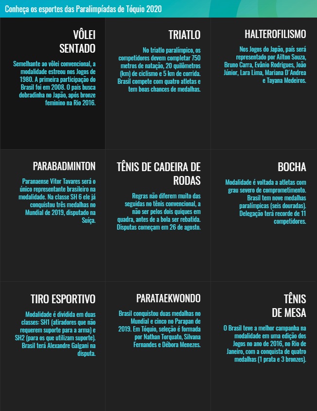 Começam nesta terça-feira (24) os Jogos Paralímpicos de Tóquio. Serão 13 dias em que atletas do mundo inteiro disputarão medalhas em 22 modalidades. Entre as estrelas do esporte paralímpico, estarão no Japão as nadadoras norte-americanas Jessica Long e McKenzie Coan e o alemão Markus Rehm, do salto em distância.