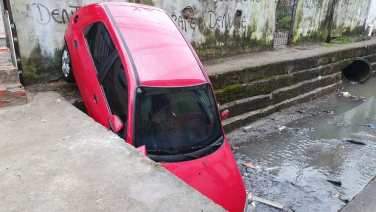 O carro de modelo celta e cor vermelha foi arrastado pela água da forte chuva que caiu durante a manhã na capital amazonense. Segundo o proprietário, ele estacionou o carro na rua Antônio José Saraiva e saiu.