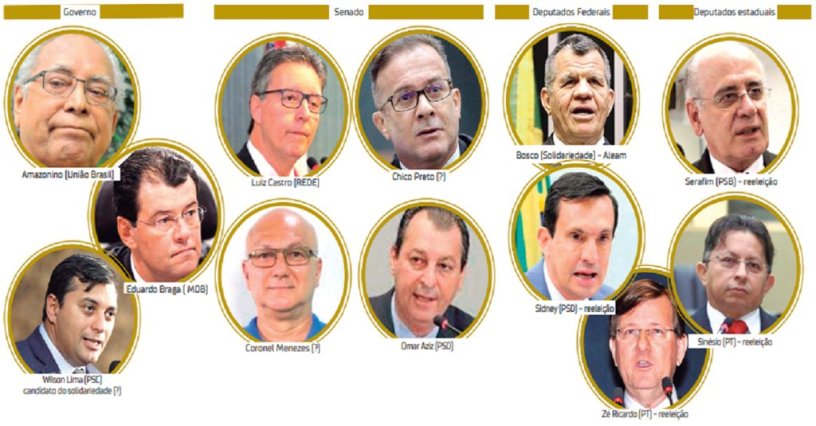 No momento, as definições para o cargo de governador repetem as principais opções da eleição de 2018. Wilson Lima (PSC) buscará a reeleição para seu segundo mandato no Amazonas. Outro nome confirmado é o de Amazonino Mendes (União Brasil), que recentemente aderiu ao novo partido com figuras que tentam emplacar ‘terceira via’ no pleito nacional. Nos bastidores, o senador Eduardo Braga (MDB) também é um dos nomes cotados para disputar a vaga.
