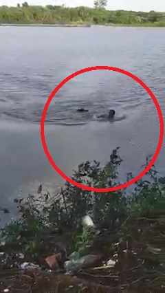 No vídeo, o homem aparece nadando rapidamente e acaba perseguido pelo jacaré; veja