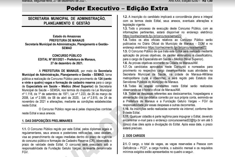 Manaus – A Prefeitura de Manaus publicou no Diário Oficial do Município (DOM) o edital para o concurso da Secretaria Municipal de Saúde (Semsa). O período de inscrições abre no próximo dia 5 de janeiro e encerra no dia 3 de fevereiro. Os três editais com todas as definições referentes ao certame, organizado pela Fundação Getúlio Vargas (FGV), estão disponíveis no endereço Fgv.br/concursos/semad22.