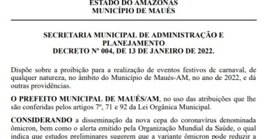 Prefeitura de Maués no Am, expede novo Decreto sobre as festas de Carnaval na cidade; Confira.