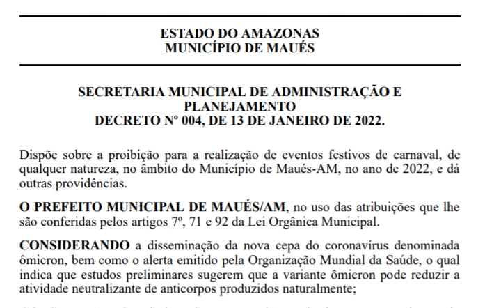 FMC – O Decreto Municipal expedido pelo Prefeito Municipal em Exercício, Sérgio Mazzini Leite Filho de nº 004, datado de 13 de janeiro de 2022, dispõe sobre a proibição para a realização de eventos festivos de carnaval, de qualquer natureza, no âmbito do Município de Maués-AM, este ano.