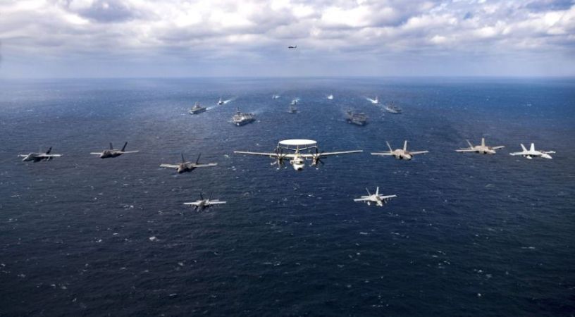 Um comunicado da Marinha dos EUA disse que a massa de navios de guerra estava “conduzindo treinamento para preservar e proteger uma região do Indo-Pacífico livre e aberta”.