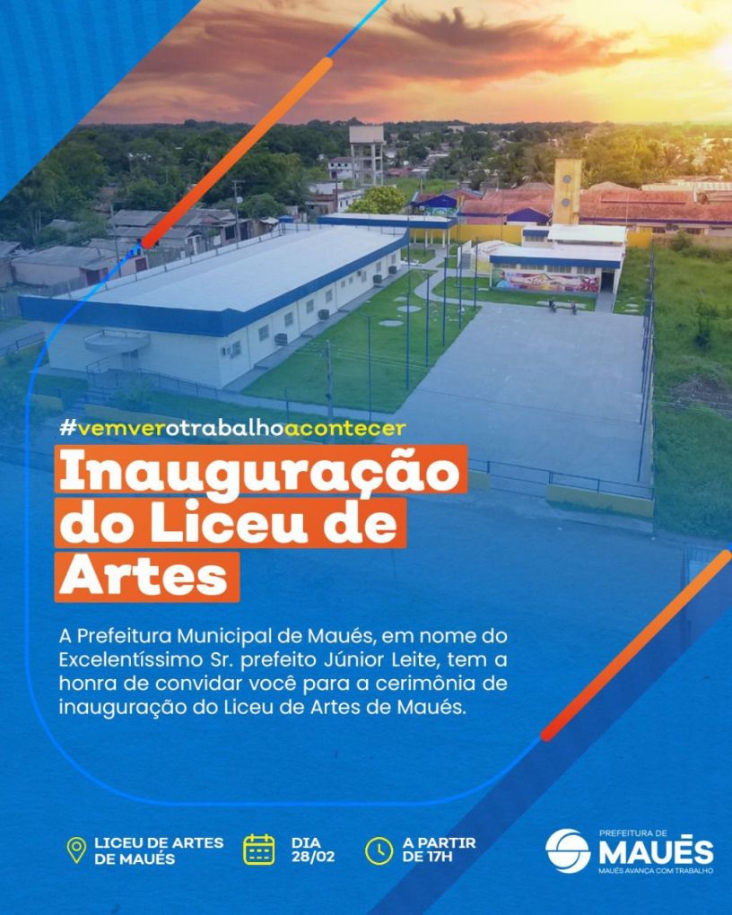 FMC – Resultado de emenda parlamentar do Deputado Federal Sidney Leite e o empenho do prefeito Júnior Leite para concretizar a obra , neste próximo dia 28 de fevereiro será inaugurado, todo equipado o Liceu de Artes do Município de Maués (a 267 km da grande Manaus), que atenderá um total de 1.100 alunos em cursos fixos e gratuitos em Dança, Teatro, Música, Piano, Teclados, Percussão, instrumentos de Sôpro, Violão, Guitarra, Artes Plásticas e Visuais.