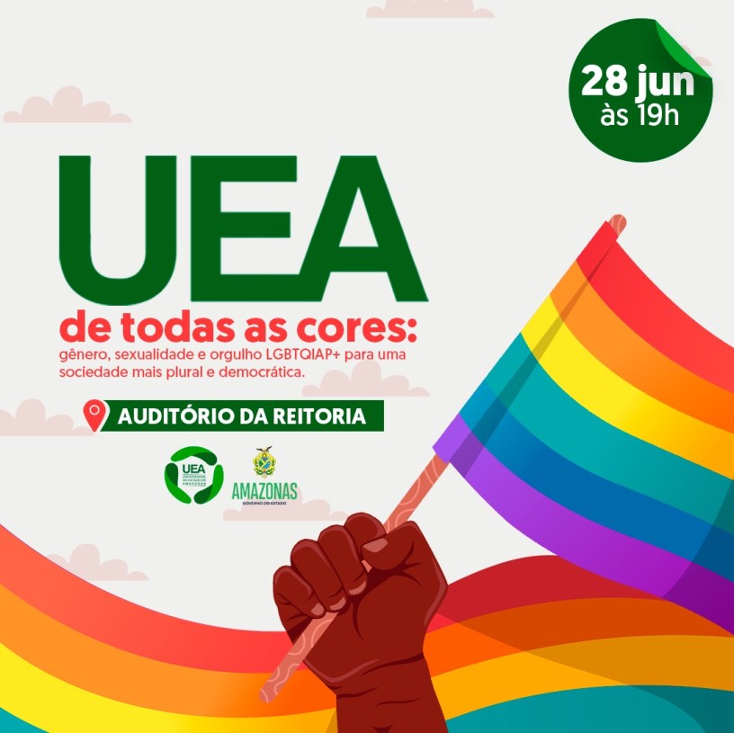 Diversidade, gênero, educação, saúde pública e direito à cidadania são as temáticas desenvolvidas pela Universidade do Estado do Amazonas (UEA), no evento “UEA de todas as cores: gênero, sexualidade e orgulho LGBTQIAP+ para uma sociedade mais plural e democrática”. O evento será no Dia Internacional do Orgulho LGBTQIAP+, terça-feira (28/06), às 19h, no auditório da Reitoria e será transmitido no canal da UEA, no YouTube. Para participar é necessário inscrever-se pelo formulário abaixo.