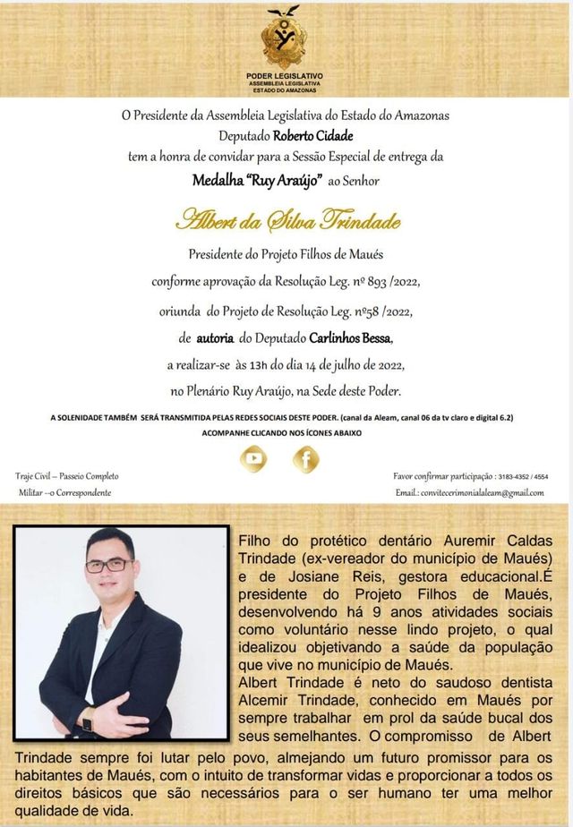 De propositura do deputado estadual Carlinhos Bessa, o maueense Albert Trindade irá receber, no dia 14 de julho, às 13 horas, a Medalha Ruy Araújo, que é a maior condecoração do Poder Legislativo, durante Sessão no Plenário da Assembleia Legislativa do Estado do Amazonas, pelos relevantes serviços prestados ao município de Maués por meio do Projeto Filhos de Maués.