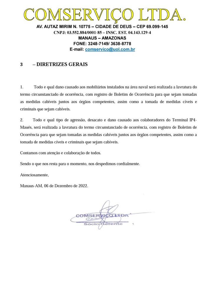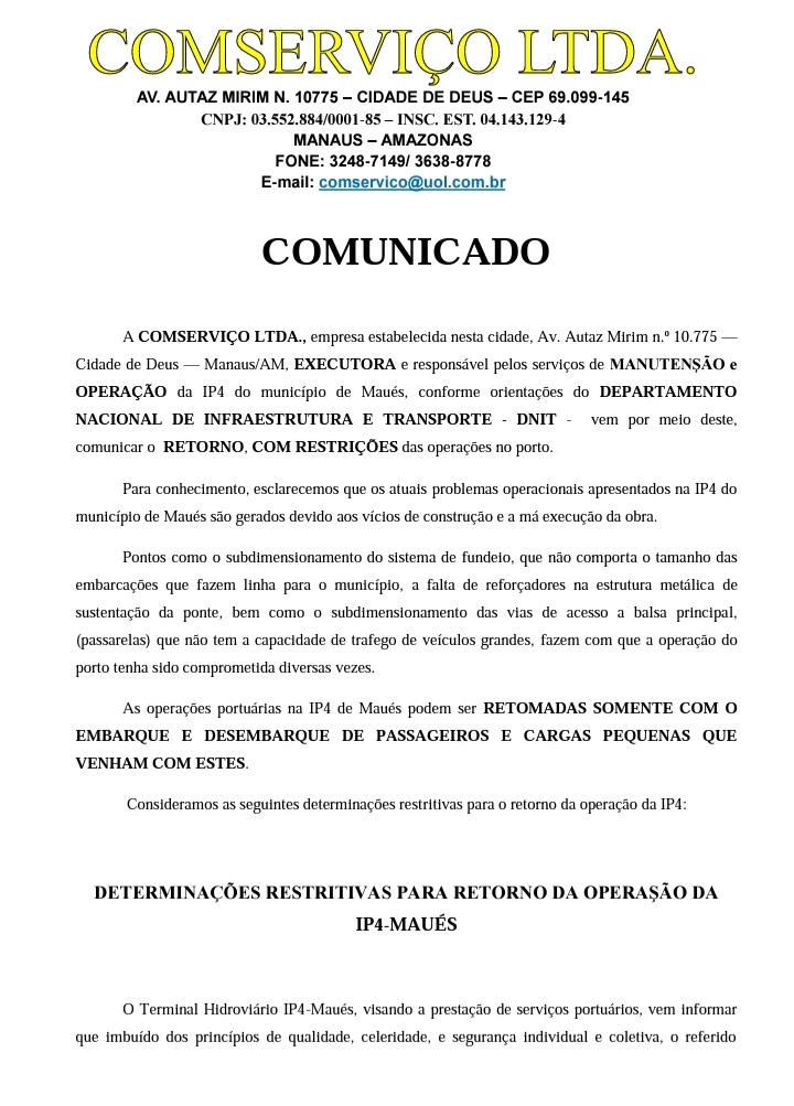 No teor da Nota você pode ler as demais restrições passarão a vigorar no Terminal Hidroviário de Maués.