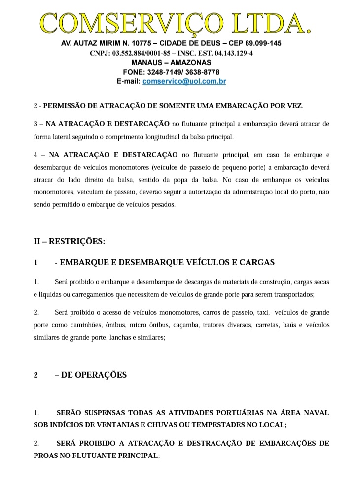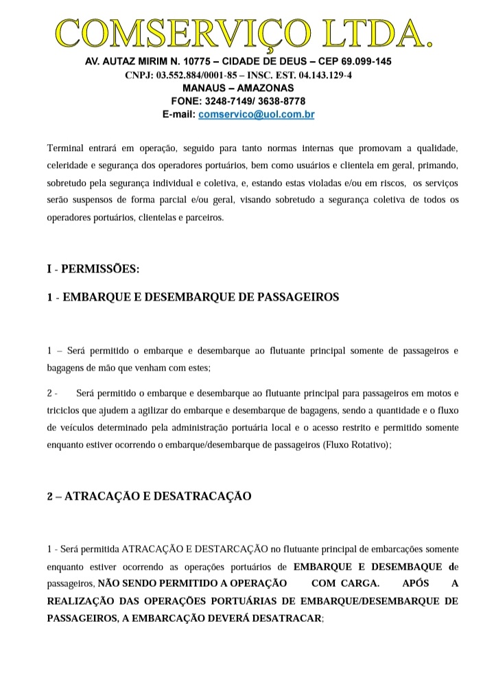 Abaixo alguns trechos do Comunicado das permissões e proibições para o Funcionamento do Terminal Portuário: