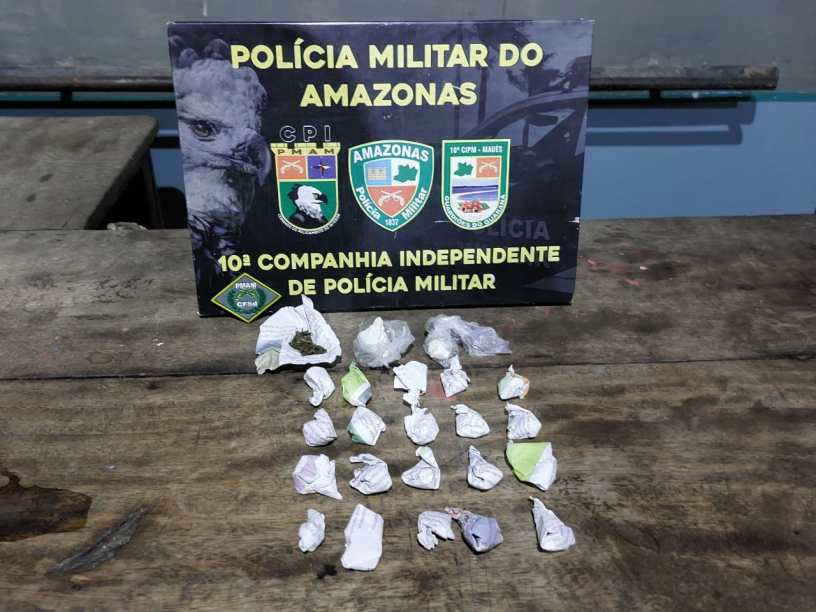 Durante a Abordagem a PM informou que foram encontrados (21) Trouxinhas de Substância Entorpecente Supostamente (Maconha), e (02) Poções de Substância Entorpecente Supostamente (Oxi). Diante dos Fatos o acusado foi encaminhado para 48ª Delegacia Interativa de Polícia Civil – DIP no centro de Maués, sem Hematomas e sem Escoriações para serem realizados todos os Procedimentos Cabíveis.
