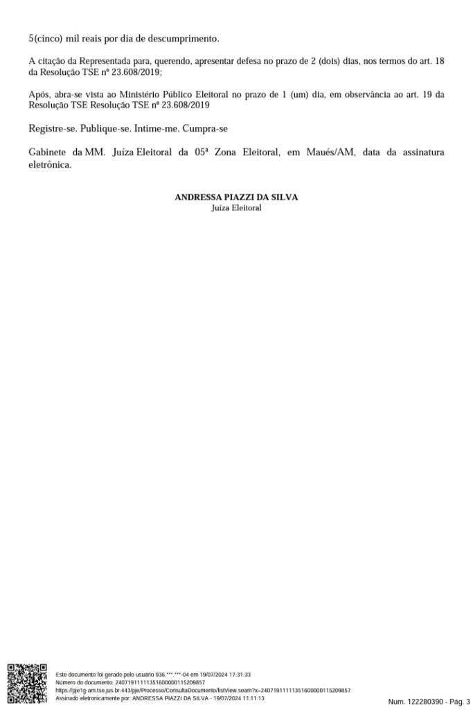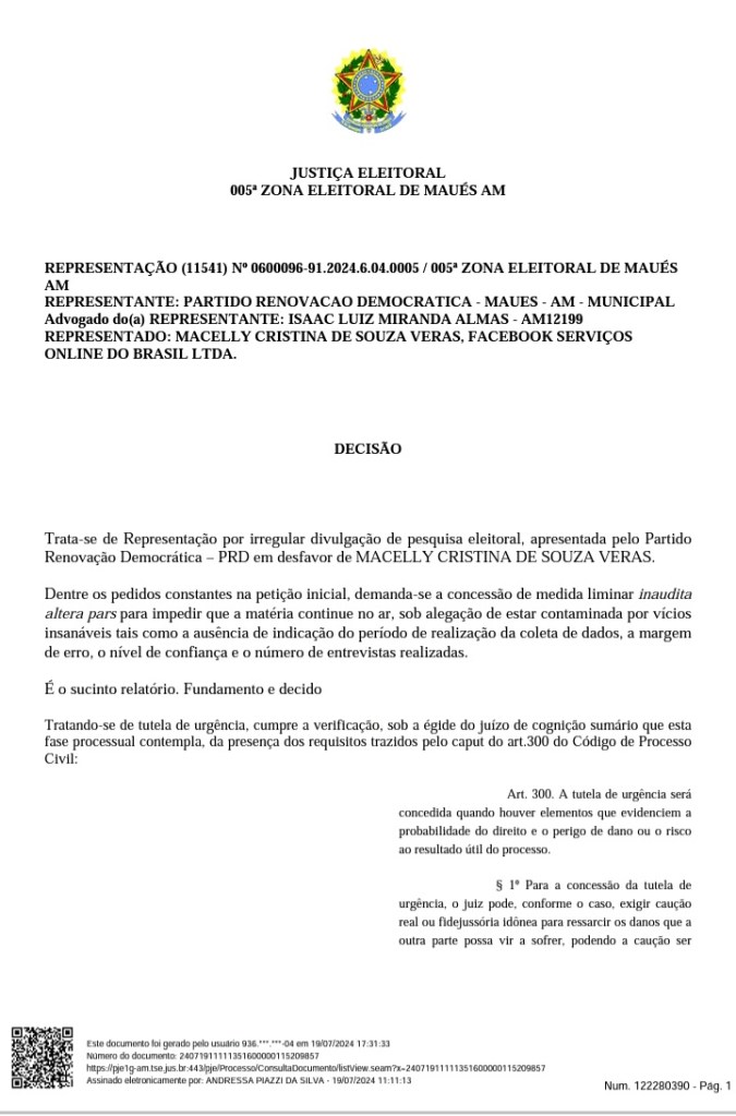 Na tarde desta sexta-feira (19), a Juíza da 5ª Zona Eleitoral do Município de Maués (a 258 quilômetros de Manaus), Andressa Piazzi determinou a Suspensão de “Pesquisa Eleitoral Fraudulenta” das redes sociais e demais veículos de comunicação, que publicaram a referida pesquisa, que favorecia a pré-candidata a prefeita de Maués, Macelly Cristina de Souza Veras, publicada no último dia 8 de julho deste ano.