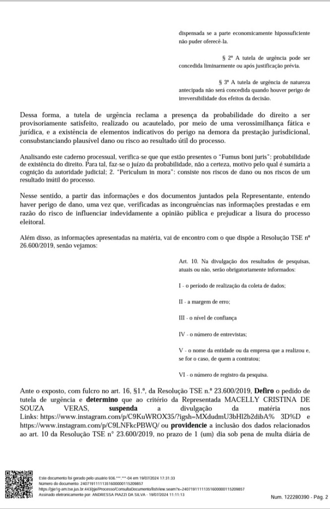 Com base no art. 16, §1.º, da Resolução TSE n.º 23.600/2019, o juiz responsável deferiu o pedido de tutela de urgência. A decisão determina que Macelly Veras, à sua escolha, suspenda a divulgação da matéria ou providencie a inclusão dos dados relacionados ao art. 10 da Resolução TSE n° 23.600/2019 no prazo de um dia, sob pena de multa diária de 5 mil reais.