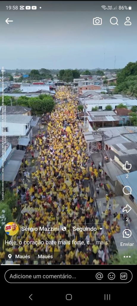 As ruas de Maués, município localizado a 258 quilômetros a leste da grande Manaus, no final da tarde deste domingo (15), ficaram pequenas para a grande multidão pessoas da passeata de Sérgio Mazzini, favorito a vencer as Eleições na Terra do Guaraná, em razão da dinâmica e progressista Administração de Júnior Leite, iniciada em 2017. O qual reconstruiu a cidade que foi deixada em ruínas em 2016, por um dos apoiadores da candidata de Oposição.