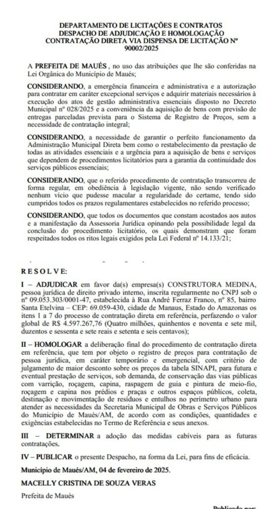 A atual gestão Municipal de Maués, contratou sem o devido processo de licitatório e sem transparência, através de dispensa de licitação, duas empresas com contratos MILIONÁRIOS, como informa no Diário Oficial dos Municípios.