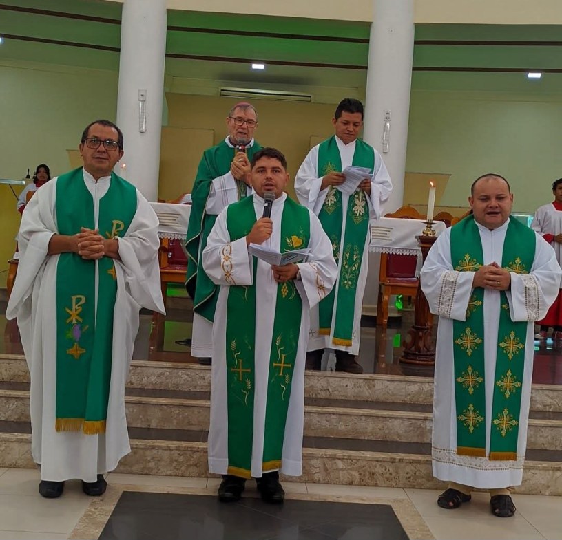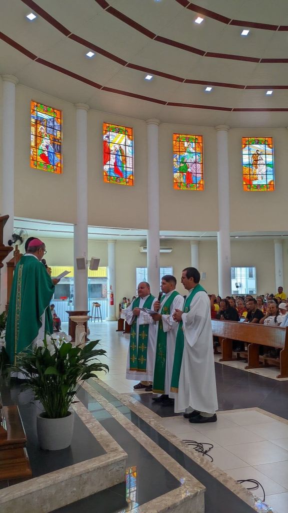 Na manhã do último domingo (23), o Bispo Emérito da Diocese de Parintins, realizou na igreja matriz de Nossa Senhora da Conceição, a posse canônica do novo pároco, Padre Jânio Negreiros, e dos vigários paroquiais Padres Orivaldo Costa e Elias Coimbra. A celebração foi marcada pela fé, unidade e compromisso com a missão pastoral da Igreja Diocesana Parintinense.