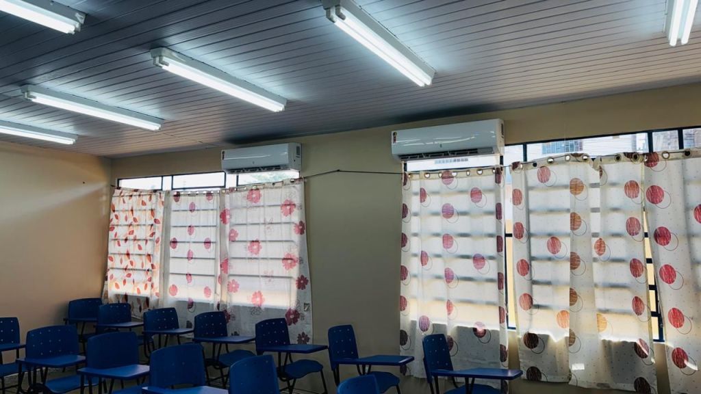 Já a escola Gilberto Mestrinho teve pequenas melhoras feitas pela prefeitura com novos condicionadores de ar, reparos na fiação e no quadro elétrico. Ainda assim, o banheiro não tem portas e a pressão da água é fraca.