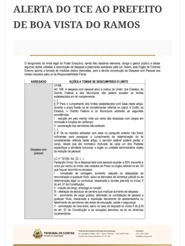 O TCE adverte o prefeito que o limite prudencial aceitável em gastos com a folha salarial de servidores é de 51,30%, mas a Prefeitura de Boa Vista do Ramos ultrapassou este teto alcançando no mês de março 55,88% de despesas com a folha de pessoal.