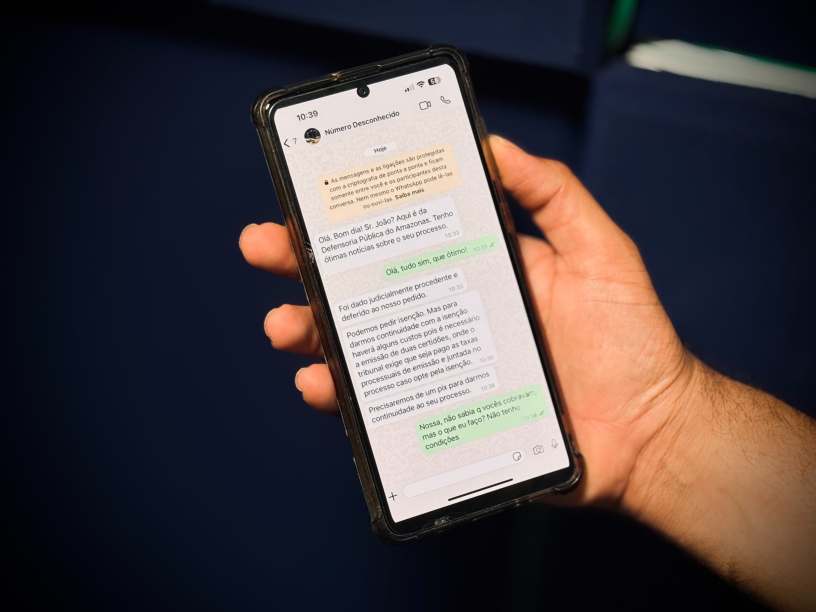 Uma das vítimas recebeu uma mensagem via WhatsApp em setembro do ano passado com informações pessoais, o número do processo aberto pela assistida com a DPE-AM e ainda um documento falso com a marca do Tribunal de Justiça do Amazonas. A mensagem era uma espécie de comunicado fraudulento que cobrava o valor de R$ 4.999,75 para que ela desse andamento na ação judicial. Ela pagou e, quando percebeu que era um golpe, registrou o caso na Delegacia Virtual do Amazonas.