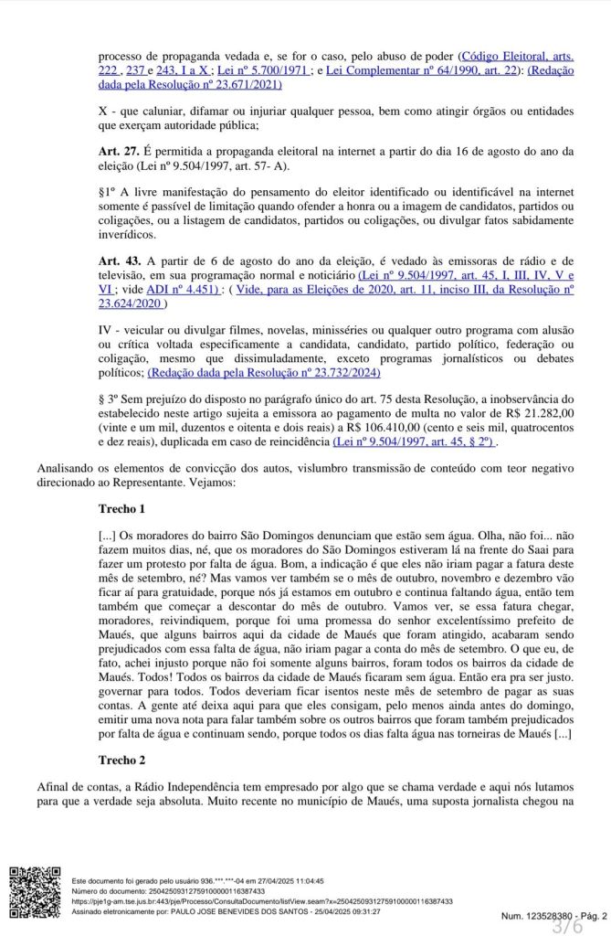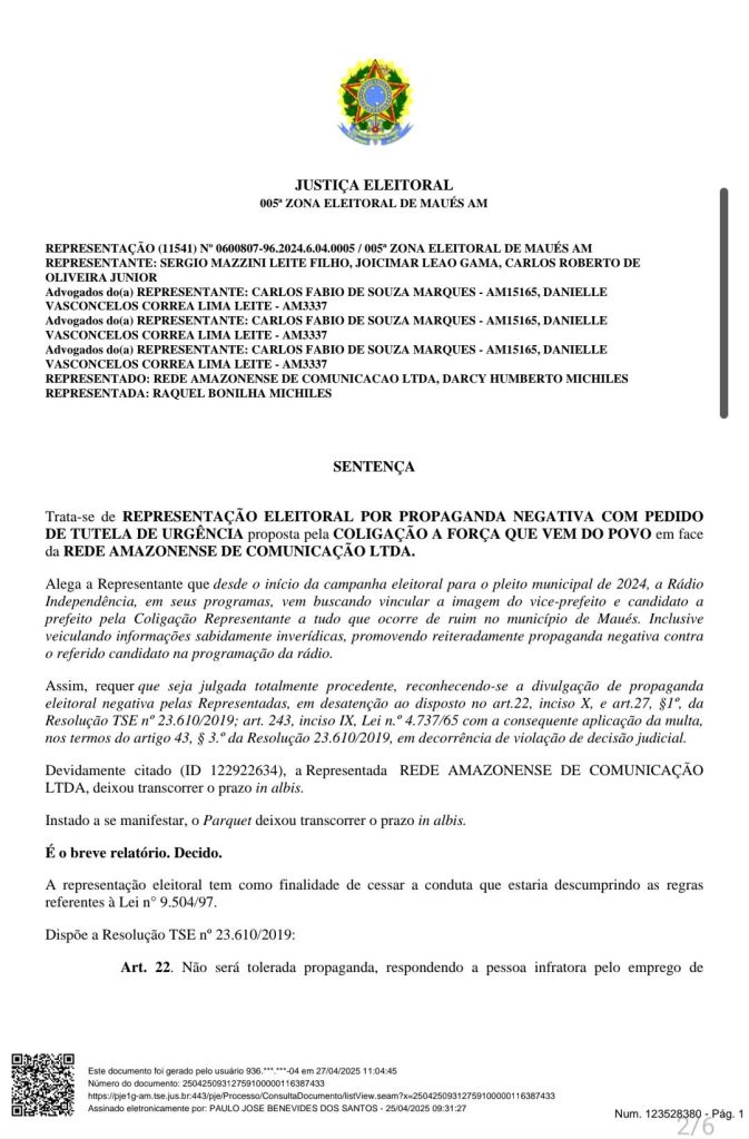 A Justiça Eleitoral da 5ª Zona Eleitoral de Maués, a 258 quilômetros de Manaus, condenou a Rede Amazonense de Comunicação Ltda., responsável pela Rádio Independência, ao pagamento de multa no valor de R$ 21.282,00 por prática de propaganda eleitoral negativa durante as eleições municipais de 2024.