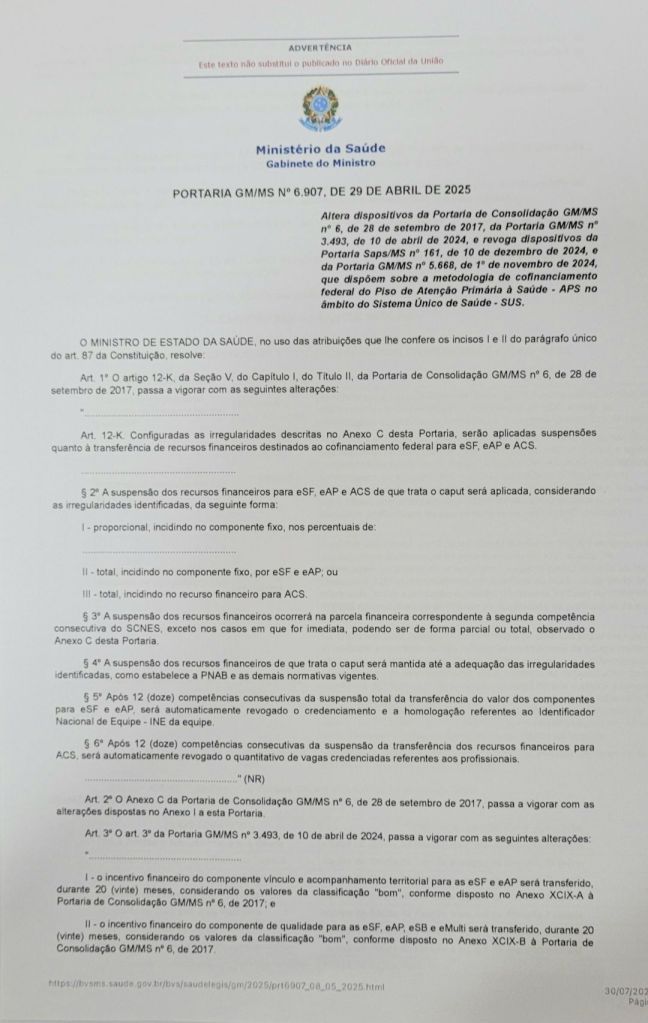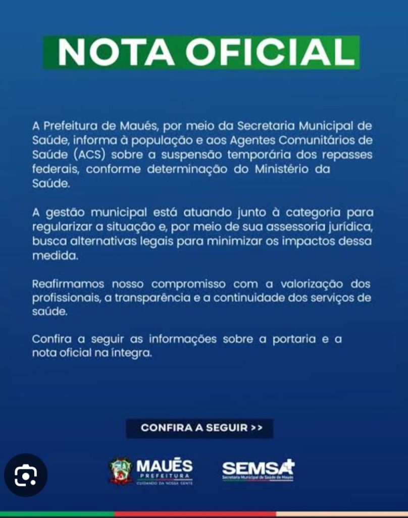 Segundo o Ex-secretário de Saúde do Município, hoje vereador, Enfermeiro Franmartony Firmo, “a Portaria GM/MS 6.907/2025 de 29 de abril deste ano, estabeleceu novos critérios para o repasse dos recursos destinados aos Agentes Comunitários de Saúde (ACS), que anteriormente não era obrigatório o envio da Produção Mensal, e mesmo assim, à SEMSA/ Maués enviava as respectivas produções”. E de acordo com o Vereador com a Nova Portaria é obrigatório os Municípios informarem, o não envio de seis Competências ao MS, ocorre a suspensão total dos recursos.