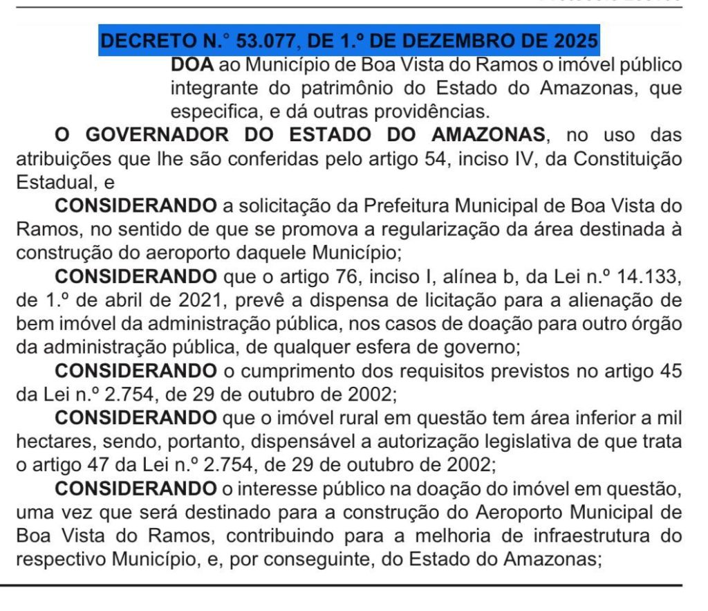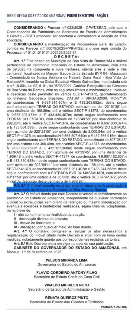 Segundo a Prefeitura do Município, a construção do tão aguardado Aeroporto Municipal de Boa Vista do Ramos, a 270 quilômetros de Manaus, avançou mais uma etapa decisiva com a publicação, no Diário Oficial do Estado do Amazonas, do decreto que oficializa a doação da área destinada ao empreendimento. O documento, assinado pelo governador Wilson Lima, transfere ao município um terreno de 59,8 hectares localizado na margem esquerda da Estrada BVR-04, na zona rural do município.